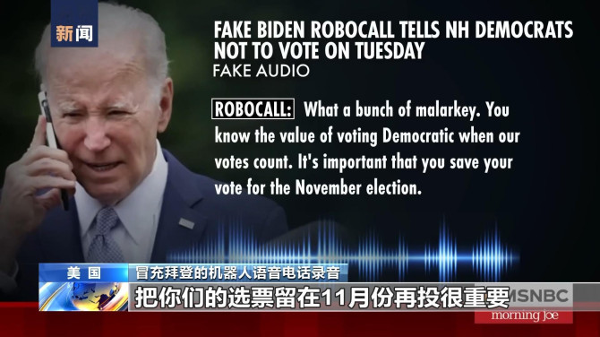 冒充拜登的机器人语音电话录音:把你们的选票留在11月份再投很重要。在这周二(23日)投票,只会让共和党人得逞,让特朗普再次当选为共和党候选人。